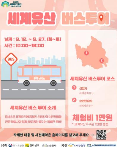 이번 버스투어는 세계문화유산 선암사와 세계자연유산 순천갯벌을 하루에 모두 탐방하는 일정으로 매주 화요일부터 토요일까지 오전 10시 10분, 순천역 시티투어 버스 승강장에서 출발한다.