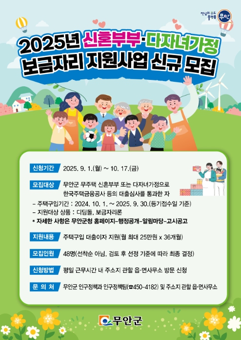 모집 규모는 총 48가구이며, 지원 대상은 한국주택금융공사 보금자리론이나 디딤돌 대출 심사를 통과해 2024년 10월 1일부터 2025년 9월 30일 사이에 6억 원 이하의 무안군에 소재한 주택을 구입한 가구다.