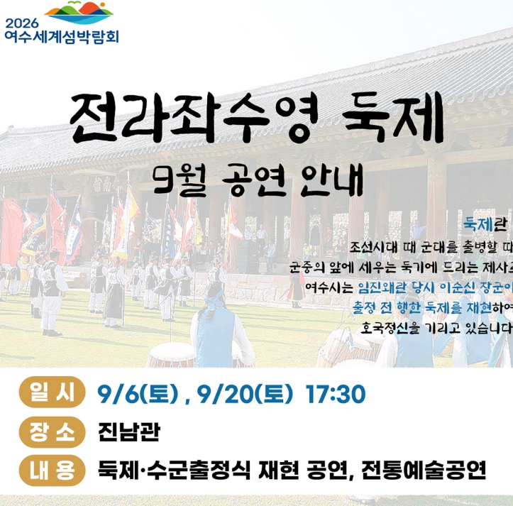 시 관계자는 “둑제를 단순한 과거 재현이 아닌 세대를 잇는 문화콘텐츠로 발전시키고 있다”며 “앞으로도 여수만의 고유한 역사와 전통을 알리고, 시민과 관광객 모두가 함께 즐기는 공연으로 자리매김할 수 있도록 발전시켜 나가겠다”고 말했다.