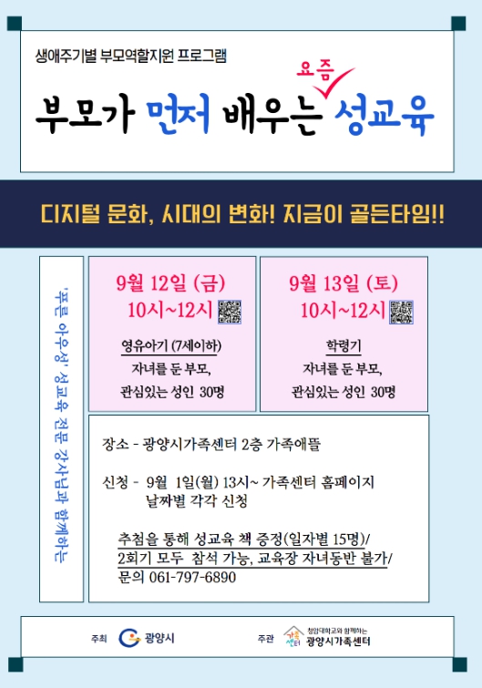 이주화 광양시가족센터장은 “성교육을 어렵게만 여기지 말고 부모가 먼저 배우고 실천하기를 바란다”며 “부모가 먼저 배우고 실천할 때 아이들은 건강하고 긍정적인 성 가치관을 자연스럽게 형성할 수 있다”고 강조했다.