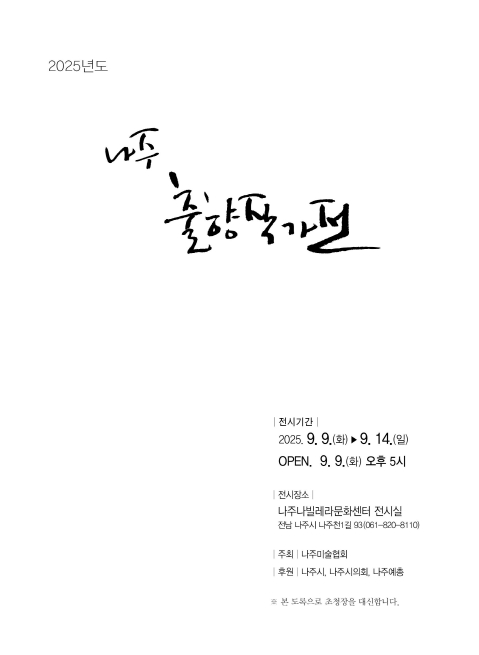 행사를 주최·주관한 나주미술협회 노근진 대표는 “출향 작가들이 고향에서 작품을 선보임으로써 지역민과의 소통의 장을 마련하고 후배 예술인들에게도 귀감이 되기를 바란다”며 “앞으로도 나주가 예술인들의 뿌리이자 창작 활동의 든든한 기반이 될 수 있도록 노력하겠다”고 말했다.