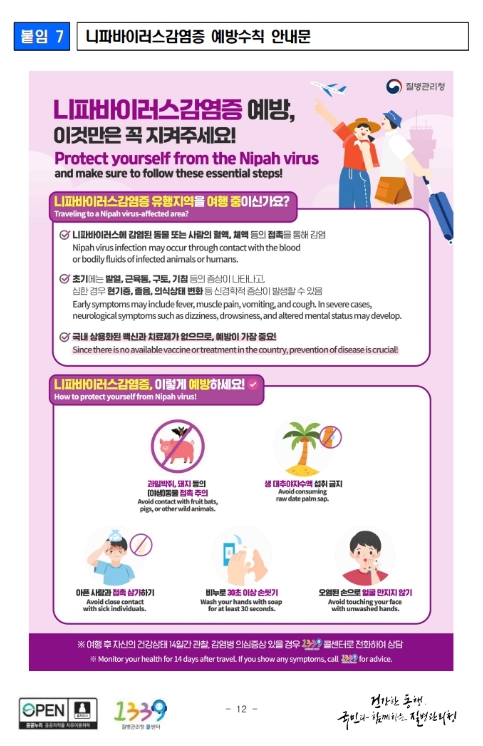 니파바이러스감염증 감염 예방 수칙으로는 ▲(야생)동물과의 접촉 피하기 ▲오염된 음료나 식품 섭취 금지 ▲환자와 직접 접촉 피하기 ▲손씻기 등 개인위생 수칙 준수이다.