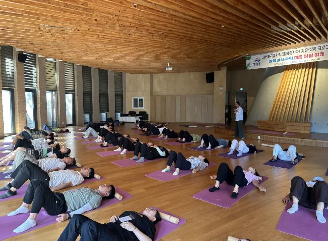 ‘돌봄종사자의 마음 힐링 여행’을 주제로 진행된 이날 행사에서는 굴림대 명상, 요가명상, 나만의 감성 향수 만들기 등 다양한 체험이 마련돼 참가자들은 바쁜 일상 속에서 잠시 마음을 내려놓고 정서적 안정을 되찾으며 활력을 충전하는 뜻깊은 시간을 보냈다.