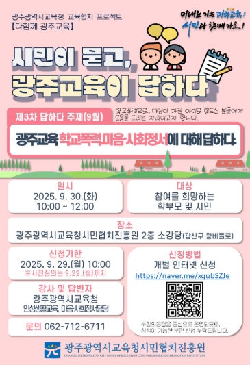 한편 시민협치진흥원은 오는 10월 29일에는 ‘국제교육, 글로벌 리더 세계 한바퀴’을 주제로 제4차 ‘시민이 묻고, 광주교육이 답하다’ 행사를 진행한다.