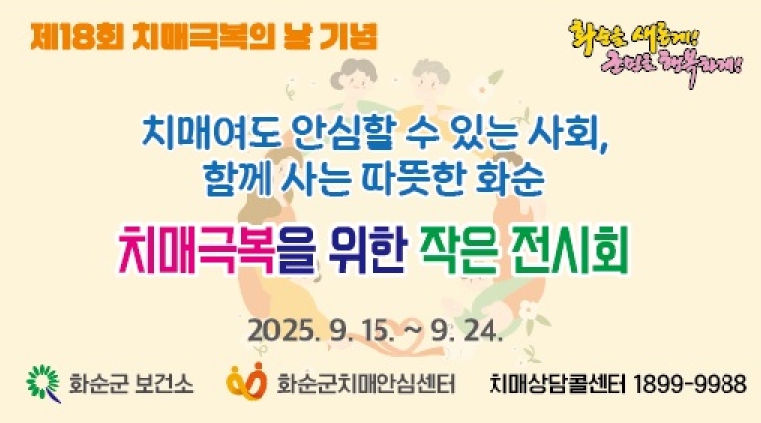 치매 극복의 날 기념 작은 전시회는 화순군 치매안심센터 1층 로비에서 열리며 치매 프로그램에 참여했던 치매 환자와 가족들의 작품을 행사 기간(15~24일)에 전시한다.