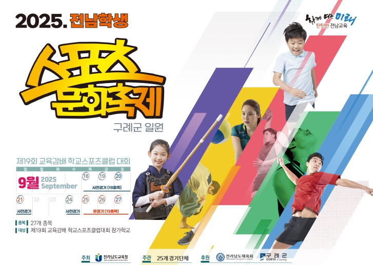 이번 축제는 ▲스포츠·문화·예술 체험 부스와 ▲제19회 교육감배 학교스포츠클럽 대회로 구성되며, 체험 부스는 구례실내체육관과 공설운동장에서 운영되며 학생들과 방문객에게 풍성한 볼거리와 재미있는 체험을 제공할 예정이다.