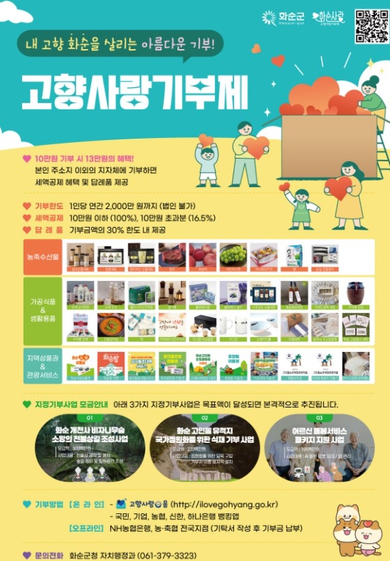 고향사랑기부제 시행 이후 지금까지 화순군에 모인 기금은 10억 원이 넘는다. 주창현 자치행정과장은 “기부자께서 소중히 모아주신 뜻을 화순군민들이 생활 현장에서 체감할 수 있는 사업으로 돌려드리겠다”라고 전했다.