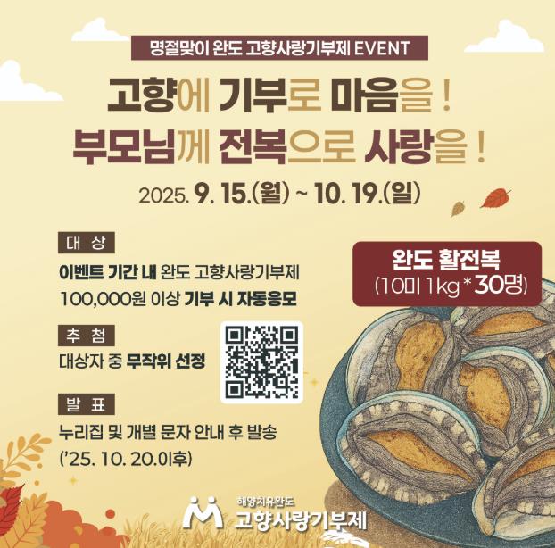 이벤트는 완도에 10만 원 이상 기부하면 자동 응모되며 기부자 중 추첨을 통해 선정된 30명에게 활전복(10미, 1kg)을 증정한다.
