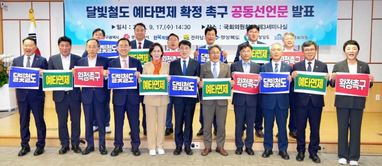 이들은 공동선언문을 통해 ▲새 정부 국정과제로 확정된 달빛철도 건설사업 추진을 위한 실질적 조치 이행 ▲달빛철도 특별법이 명시한 예비타당성조사 면제 조속 확정 ▲남부 거대경제권 조성에 범정부적 지원과 협조 약속 등을 촉구했다.