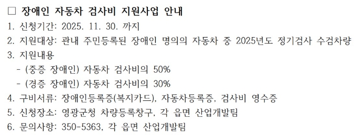 영광군 관계자는 “자동차 정기검사는 교통사고 예방과 대기환경 개선에 필수적인 절차”라며, “경제적 사유로 검사를 미루는 일이 없도록 장애인 분들께 실질적인 혜택을 드리고자 한다” 라고 전했다.