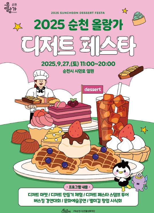 행사에서는 ▲순천 대표 디저트 마켓 20개소 부스 운영 ▲디저트 만들기 체험 ▲건강 힐링 체험 ▲올랑가 별미길 창업 2기 시식회 ▲원도심 페이백 이벤트 등 다양한 부대행사가 진행된다.