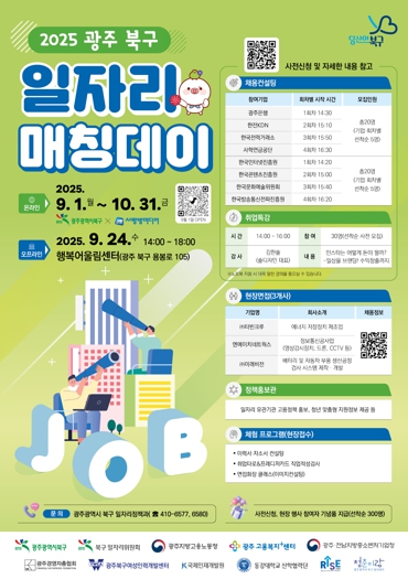 문인 북구청장은 “올해 일자리 매칭데이는 어려운 경제 상황에서도 구인 기업과 구직자가 한자리에 모여 서로 원하는 바를 이룰 수 있도록 세심하게 준비했다”며 “앞으로도 구직자와 기업이 체감할 수 있는 다양한 일자리 정책을 적극 추진해 나가겠다”고 말했다.