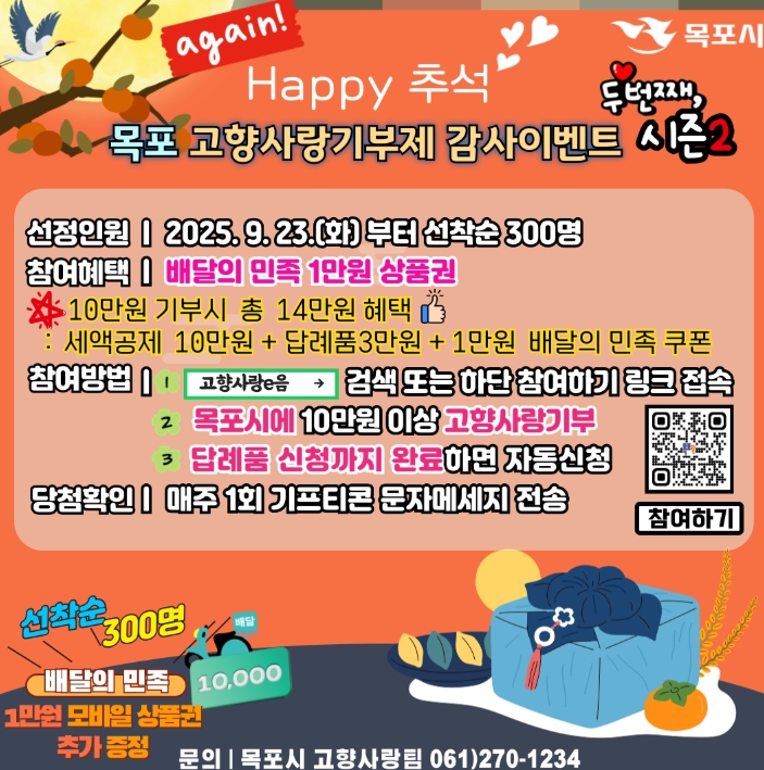 참여 방법은 1차 때와 동일하다. 9월 23일부터 목포 고향사랑기부제에 10만 원 이상 기부 후 답례품을 신청하면 자동 응모되며, 선착순 300명까지 진행된다. 당첨자에게는 배달의민족 모바일 교환권(1만 원권)이 경품으로 제공된다.
