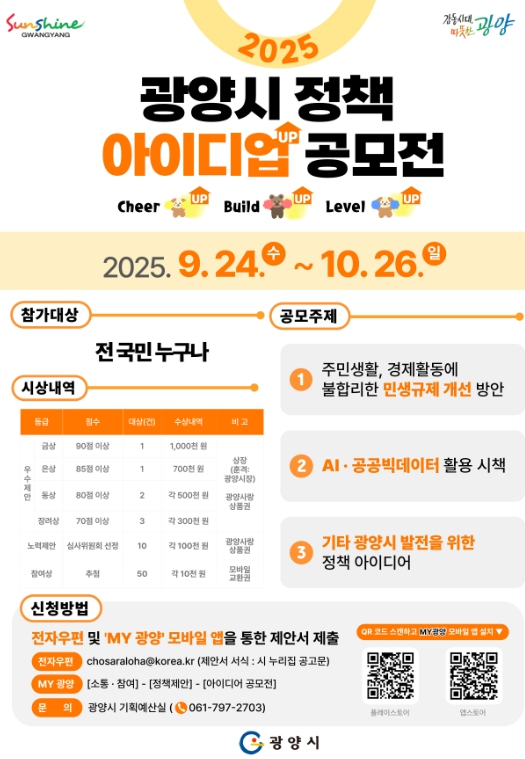 공모전 명칭은'광양시 정책 아이디업(UP) 공모전'으로, 시민들의 삶을 응원하고(Cheer up), 더 나은 정책을 함께 만들어(Build up), 광양시가 한층 더 높이 도약하는(Level up) 계기를 마련하고자 기획됐다.