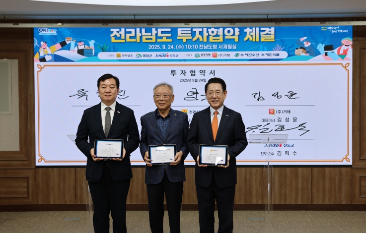24일 전라남도청에서 전라남도와 영암군이, ㈜해진수산, ㈜해진식품과 투자협약을 체결하고 협력을 약속했다.