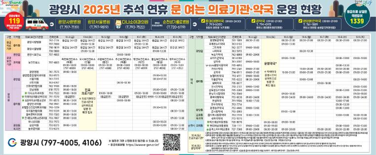 추석 연휴 문 여는 의료기관과 약국 현황은 ▲광양시 모바일 앱 ‘MY광양’ ▲시 누리집(홈페이지) ▲광양시 블로그 등 SNS ▲129 보건복지콜센터를 통해 확인할 수 있다.
