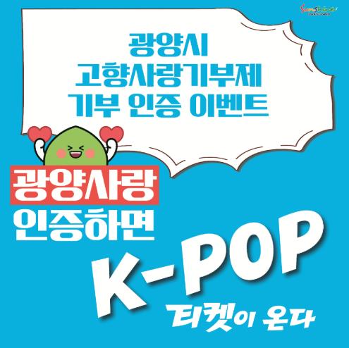 이번 이벤트는 ▲고향사랑기부제 기부 인증 ▲디지털 광양시민 할인가맹점 영수증 인증 두 가지 방식으로 참여할 수 있으며, 당첨자에게는 10월 17일과 18일 열리는 제5회 광양 K-POP 페스티벌 지정석 입장권이 제공된다.