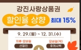 강진 코리아피플뉴스2025. 09.24[코리아피플뉴스]강진군은 9월29일부터 12월31일까지 강진사랑상품권 할인율을 상향 조정한다고 24일 밝혔다. 추석 명절 맞이 및 지역경제 회복을 위해 마련된 할인 혜택은 지류 및 모바일(착) 강진사랑상품권 구매 시 선할인 10%이며, 기간 중 모바일(착) 사용 시 후캐시백 적립 5%로 총 15% 할인 혜택을 받을 수 있다. 구매 한도는 월 70만 원으로 동일하다. 다만, 모바일(착) 상품권 후캐시백은 매월 1억 원을 투입할 예정으로 예산소진 시 운영이 종료되므로 혜택을 받기 위해서는 빠르게 소비하는 것이 유리하다. 관내 …