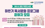 여수 코리아피플뉴스2025. 09.22[코리아피플뉴스]여수시는 9월 22일부터 26일까지 공립 작은도서관 ‘2025년 하반기 독서문화 프로그램’ 수강생을 모집한다. 이번 프로그램은 유아부터 성인까지 다양한 연령층이 참여할 수 있도록 총 9개로 마련됐으며 오는 10월부터 11월까지 프로그램별 총 6회씩 운영된다. 운영 작은도서관은 ▲여문늘벗(구 중부보건지소) ▲꿈을키우는(미평 선경 3차 아파트) ▲화양열린(화양면민회관 2층) ▲청솔글누리(돌산 청솔 2차 아파트) 등 4곳이다. 성인 대상 프로그램은 ▲시니어, 그림책 속 색감의 조화를 이루다 ▲글이 머무는 수채화 ▲나…