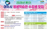 여수 코리아피플뉴스2026. 01.19[코리아피플뉴스]여수시가 시민들의 교육 기회 확대를 위하여 평생학습관에서 제1기 정규 프로그램 수강생을 오는 1월 26일부터 28일까지 3일간 모집한다. 이번 정규 프로그램은 시민들의 평생학습 기회 확대를 위해 차별성과 실용성을 모두 갖춘 과정들로 구성됐다. 특히 AI와 인문, 예술, 운동 분야를 아우르는 최신 경향 반영 과목들이 눈길을 끈다. 주요 강좌로는 ▲Suno AI 디지털 싱글 제작 ▲AI로 만드는 섬박람회 홍보영상 제작 ▲AI 시대 안목을 높이는 로컬디자인 ▲섬, 민화를 품다 등이 있으며 36개 과목으로 총 895…