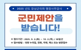 교육 코리아피플뉴스2025. 08.29[코리아피플뉴스]장성군의회는 오는 9월 2일부터 10월 2일까지 30일간 ‘2025년도 행정사무감사 군민제안 창구’를 운영한다고 밝혔다. 제안 대상은 ▲군 주요 시책과 사업의 개선·건의사항 ▲위법·부당한 행정 사례 등이다. 단, 개인 사생활 침해, 단순 숙원사업, 재판·수사 중인 사건, 명예훼손 우려가 있는 사항, 익명 제안 등은 제외된다. 이번에 접수된 내용은 장성군의회 행정사무감사 대상에 반영하거나 참고자료로 활용될 예정이며, 군민제안은 방문접수 또는 전화, 팩스 및 우편이나 장성군의회 누리집을 통해 가능하다. 심민섭 …