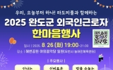 구청 코리아피플뉴스2025. 08.18[코리아피플뉴스]완도군은 8월 26일 오후 7시, 완도 해변공원 야외 음악당에서 외국인 근로자와 주민이 함께 어우러지는 『2025 외국인 근로자 한마음 행사』를 개최한다. 군은 지난 2022년부터 필리핀, 라오스 등과 해외 인력 확보를 위한 업무 협약(MOU)을 체결해 안정적인 외국인 노동력 유치에 힘써왔으며, 결혼이민자 정착 지원, 다문화가정 교육, 외국인 근로자 복지 등 다양한 시책을 추진 중이다. 현재 군에는 1,100여 명의 외국인 근로자가 거주하고 있으며, 그중 결혼이민자 가족의 초청을 통해 근무하고 있는 인력도 다수 …