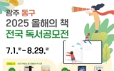 구청 코리아피플뉴스2025. 06.30[코리아피플뉴스]광주 동구는 책과 함께 소통하며 행복한 인문도시를 조성하고자 2025 ‘올해의 책’ 전국 독서공모전을 개최한다고 밝혔다. 이번 공모전은 전 국민을 대상으로 하며, 접수 기간은 7월 1일부터 8월 29일까지다. 부문은 ▲‘올해의 책’ 독후감(초등부/중고등부/성인부) ▲함께 읽는 우리(가족·단체) 2개이며, 온라인 공모로 진행된다. 공모전 대상도서는 2025 ‘올해의 책’ 선정도서(10권)이며, 부문별로 유아도서는 ▲바나나가 더 일찍 오려면(정진호) ▲숲속 재봉사의 옷장(최향랑)이며, 어린이 도서는 ▲들개왕(곽영미)…