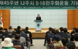 나주 코리아피플뉴스2025. 05.19[코리아피플뉴스]나주시는 5월 19일 오전 10시, 나주시민회관 2층 강당에서 ‘제45주년 5‧18 민주화운동 기념식’을 개최하고 오월 정신의 역사적 의미를 되새기는 시간을 가졌다. 이날 기념식은 ‘아! 오월, 다시 만난 오월’을 슬로건으로 윤병태 나주시장과 신정훈 국회의원, 이재남 시의장, 김석기 광주지방보훈청장을 비롯해 5‧18 유공자와 유족, 시민 등 200여 명이 참석했다. 행사는 식전 추모공연을 시작으로 국민의례, 기념사, 추념사, ‘임을 위한 행진곡’ 제창, 헌화와 분향순으로 이어졌다. 이날 추모공연은 만월 놀이패 살…