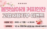 영암 코리아피플뉴스2025. 04.07[코리아피플뉴스]영암군이 이달 7~30일 봄 맞이 고향사랑기부제 특별이벤트 ‘봄 햇살 아래 커피 한 잔’을 진행한다. 영암군에 10만원 이상 고향사랑기부한 기부자에게 5,000원 상당의 커피 쿠폰을 추가 증정하는 내용. 이번 이벤트는 고향사랑기부에 대한 감사의 마음을 담아 커피 한 잔의 여유를 즐기도록 마련됐다. 고향사랑기부는 온라인 ‘고향사랑e음’, ‘위기브’ 또는 전국 농·축협에서 할 수 있다. 이영주 영암군 홍보전략실장은 “고향사랑기부로 지역에 좋은 일도 하고, 커피 한 잔도 즐기며 상춘의 즐거움도 함께 누려보길 …