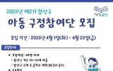 구청 코리아피플뉴스2025. 04.02[코리아피플뉴스]광주 광산구는 아동의 참여권 보장과 아동 권리증진을 위해 제2기 광산구 아동구정참여단을 25일까지 모집한다고 2일 밝혔다. 아동 구정참여단은 아이들의 눈높이에서 아동 정책에 대해 다양한 의견을 제시하고, 정책에 반영될 수 있도록 구성한 아동 참여기구다. 모집 대상은 광산구에 거주하거나 광산구 소재 학교에 재학 중인 10세∼15세 아동(초4∼중3) 40명을 선발한다. 선발된 아동은 6월 발대식을 시작으로 6개월간 △정책의제 발굴·제안 △어린이 모의의회 체험 △아동권리 교육 및 캠페인 △정책 결의문 발표회 등 다양…