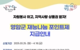 완도 코리아피플뉴스2025. 03.31[코리아피플뉴스]영암군자원봉사센터가, 4/18일까지 ‘2025년도 재능 나눔 포인트’ 신청을 받는다. 자원봉사 활동 지지, 지역경제 활성화 등을 취지로 한 재능 나눔 포인트를 받을 이들은, 총 122명으로 ‘1365자원봉사포털’ 기준 지난해 50시간 이상 봉사자들이다. 포인트 신청은 ‘재능기부 영암나눔e’ 홈페이지에서 할 수 있고, 인정 봉사 시간에 따라 영암군은 5~15만원의 지역사랑상품권을 제공할 예정이다. 포인트를 받을 봉사자에게 안내 문자를 발송한 영암군은, 온라인 신청자에게는 ‘월출페이’ 앱으로 지역사랑상품권을 지…
