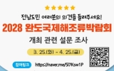 여수 코리아피플뉴스2025. 03.28[코리아피플뉴스]완도군은 ‘2028완도국제해조류박람회’에 대한 전남도민 인식 설문 조사를 4월 25일까지 실시한다. 군은 설문 조사를 통해 박람회에 대한 도민 관심도와 기대 효과, 참여 의향 등을 분석하여 국제 행사 승인을 위한 자료로 활용할 계획이다. 설문 항목은 국제해조류박람회에 대한 인지도 및 관심도, 전남 해조류 산업의 글로벌 경쟁력 가능성, 참여 희망 콘텐츠 및 프로그램 유형 등 35개이다. 설문 조사는 온라인 또는 QR코드를 통해 모바일로도 할 수 있다. 군 관계자는 “설문조사는 2028완도국제해조류…