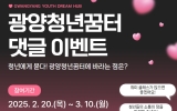 광양 코리아피플뉴스2025. 02.21[코리아피플뉴스]광양시와 광양청년꿈터가 지역 청년들의 목소리를 직접 듣기 위해 오는 3월 10일까지 ‘양청년꿈터 댓글 이벤트’를 진행한다. 광양시에 거주하는 18세부터 45세까지의 청년이라면 누구나 이번 이벤트에 참여할 수 있다. 참여 방법은 간단하다. 먼저 광양청년꿈터 인스타그램을 팔로우하거나 네이버 블로그를 이웃 추가한 뒤, ‘광양청년꿈터에 바라는 점’ 게시글에 희망 프로그램이나 청년정책에 대한 의견을 댓글로 작성하면 된다. 이후, 팔로우 인증과 댓글 작성 화면을 네이버 폼으로 제출하면 참여가 완료된다. 휴대전화 번호…