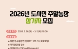 광양 코리아피플뉴스2026. 02.23[코리아피플뉴스]광양시는 도심 속에서 농업을 체험하며 가족과 함께 건강한 여가를 보낼 수 있는 ‘2026년 도시민 주말농장’ 참가자를 2월 26일부터 3월 5일까지 모집한다고 밝혔다. 도시민 주말농장은 시민이 일정 구획의 텃밭을 분양받아 직접 작물을 재배하는 체험형 농업 프로그램으로, 농업에 대한 이해를 높이고 건강한 먹거리의 가치를 체험할 수 있도록 매년 운영되고 있다. 신청 대상은 공고일 이전 주민등록상 주소지가 광양시인 시민이며, 참가비는 1만 원이다. 올해는 ▲일반텃밭 90구획 ▲은퇴자텃밭 20구획 ▲다자녀가정 텃밭 20…