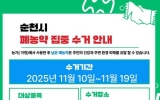 화순 코리아피플뉴스2025. 11.06[코리아피플뉴스]순천시는 농가와 가정에서 사용 후 남은 폐농약과 유효기간이 지난 농약을 안전하게 수거하기 위해 폐농약 집중수거 기간을 운영한다고 밝혔다. 집중수거 기간은 오는 10일부터 19일까지이며, 수거는 읍・면 행정복지센터와 순천시 업사이클센터 더새롬에서 수거가 진행된다. 농민과 시민은 가까운 수거장소를 이용해 폐농약을 안전하게 배출할 수 있다. 이번 사업은 농가에 방치되기 쉬운 폐농약을 체계적으로 수거・처리해 환경오염을 예방하고 시민 안전을 강화하는 데 목적이 있다. 수거된 폐농약은 폐기물 전문처리업체를 통해 안전하게…