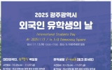 광주 코리아피플뉴스2025. 10.29[코리아피플뉴스]광주광역시는 ‘2025 광주 외국인 유학생의 날’ 행사에 참가할 유학생을 오는 11월7일까지 모집한다. ‘광주 외국인 유학생의 날’은 외국인 유학생들이 자신의 재능을 발휘하고, 내국인 청년·시민들과 문화 교류를 통해 지역 정착을 돕는 축제의 장으로, 광주시는 지난 2023년부터 해마다 개최하고 있다. 올해 행사는 오는 11월13일 5·18민주광장에서 ‘전남대 국제교류의 날’ 행사와 함께 열리며 유학생 장기자랑, 대한외국인 N행시 백일장, 유학생활 토크 콘서트(V-talk) 등 다양한 프로그램이 마련된다. 참가자…