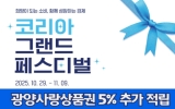 광양 코리아피플뉴스2025. 10.29[코리아피플뉴스]광양시는 전국 단위 소비진작 행사인 ‘코리아 그랜드 페스티벌(Korea Grand Festival)’ 기간(2025. 10. 29.~11. 9.) 동안 광양사랑상품권 할인율을 한시적으로 18%로 상향한다고 밝혔다. ‘코리아 그랜드 페스티벌’은 국무조정실, 기획재정부, 행정안전부, 산업통상자원부와 행정안전부, 문화체육관광부 등 관계 부처가 공동으로 추진하는 국가대표 소비축제다. 행사 기간에는 △지역사랑상품권 및 디지털온누리상품권 특별할인 △상생소비복권 (20억 원 규모) 신규 시행 △농·축·수산물·생필품 특별할인…