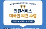 광양 코리아피플뉴스2026. 04.09[코리아피플뉴스]광주시교육청은 민원서비스 품질 향상을 위해 오는 9~20일 국민권익위원회 온라인 정책참여 플랫폼 ‘국민생각함’과 ‘시교육청 누리집’을 통해 대국민 의견을 수렴한다. 이번 의견 수렴은 국민의 다양한 목소리를 민원행정과 제도개선에 반영해 광주교육 민원서비스 만족도를 높이기 위해 추진됐다. 의견 수렴 내용은 ▲민원서비스 향상을 위한 제도 개선 ▲민원실 편의시설 및 환경 개선 ▲기타 민원서비스 이용 시 불편사항 및 개선 아이디어 등이다. 지난해 실시한 ‘2025년 민원서비스 개선 대국민 의견수렴’에는 595명의 국민…